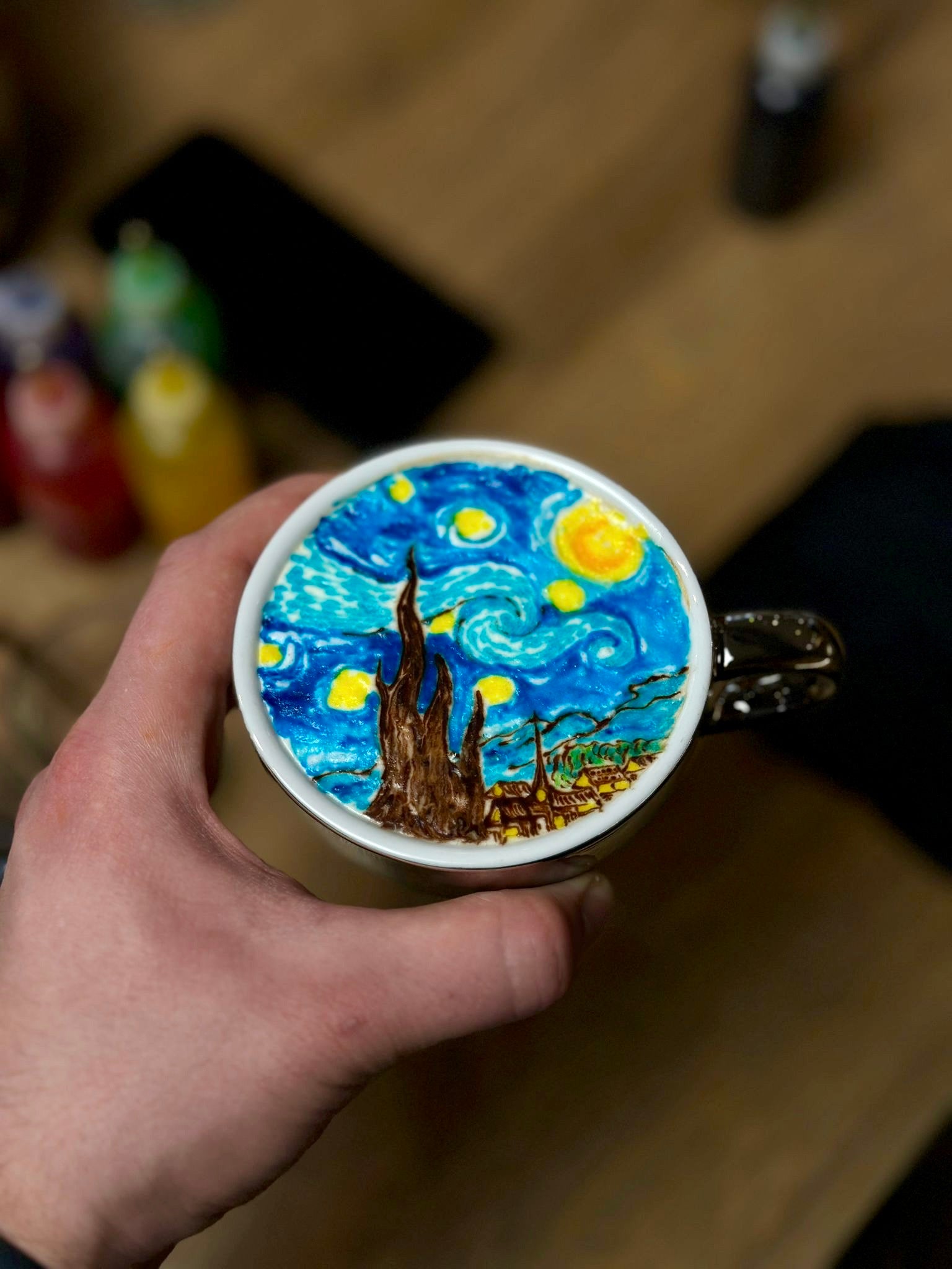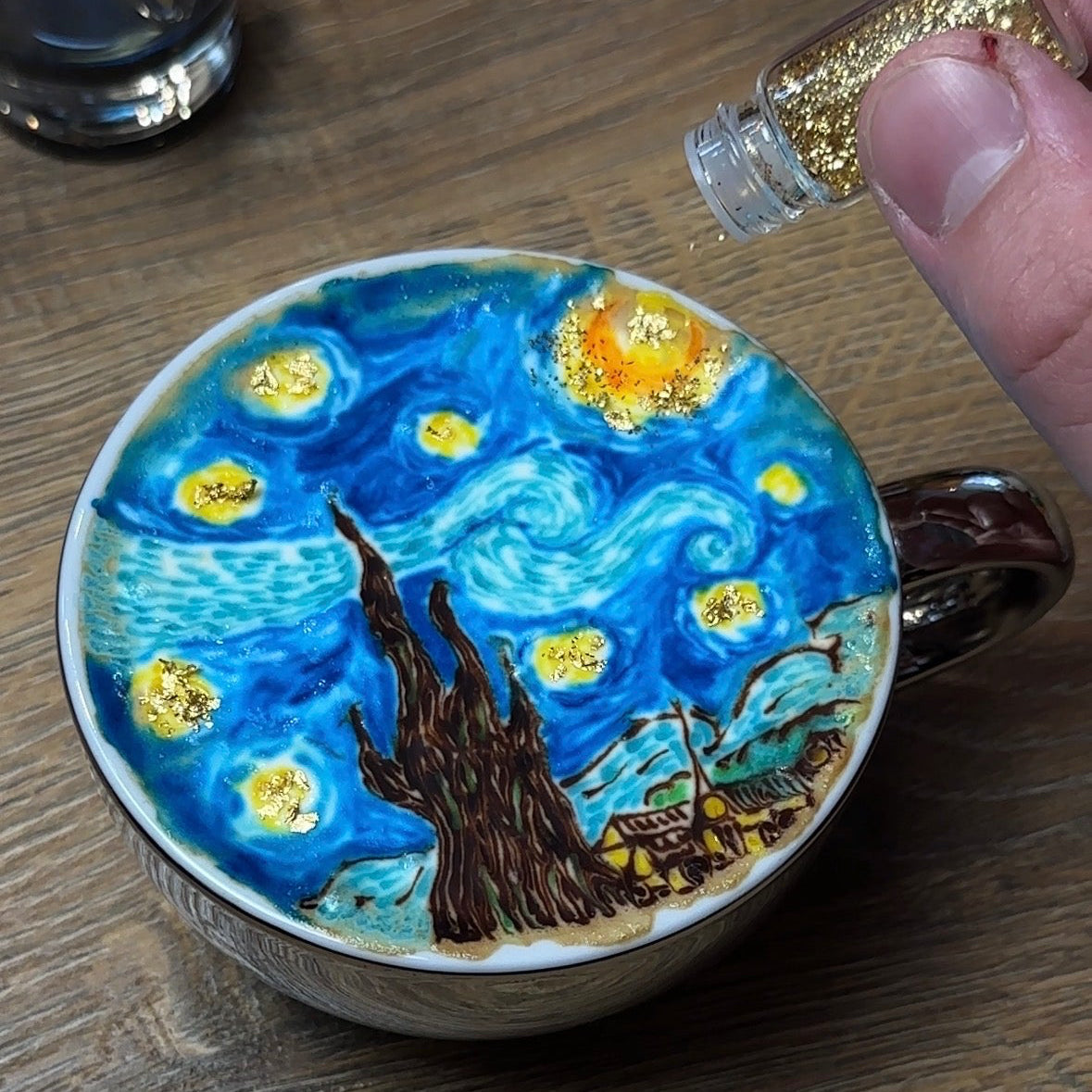 A private commission for a sponsor from Dubai gave birth to one of the most distinctive works created by Francesco Bozzato: a cappuccino inspired by Van Gogh’s Starry Night, finished with 18-karat gold. Not designed for repetition, not created for display — but crafted as a singular expression of precision, patience, and control.